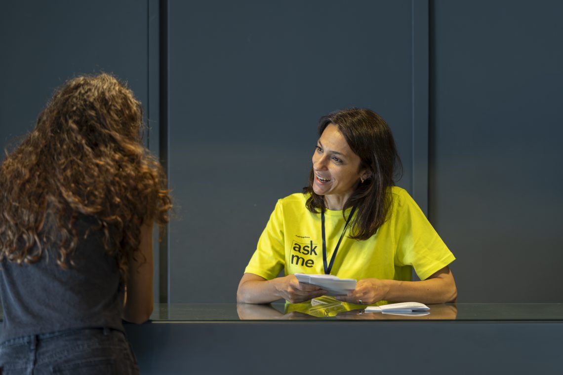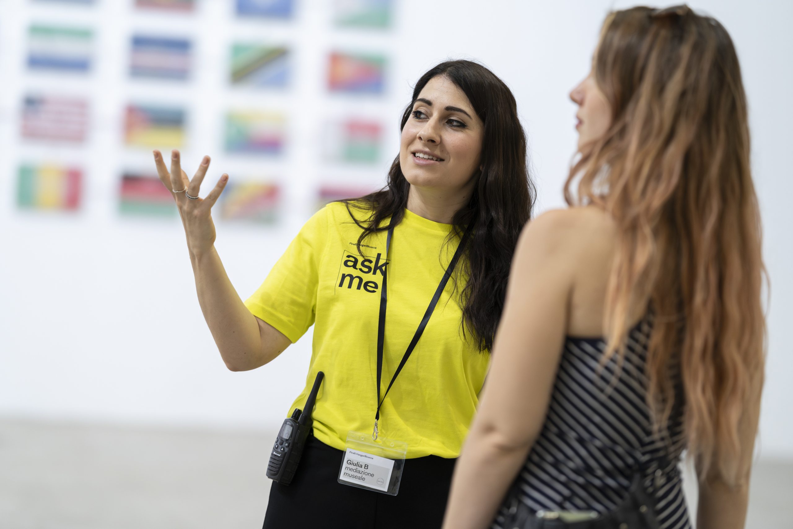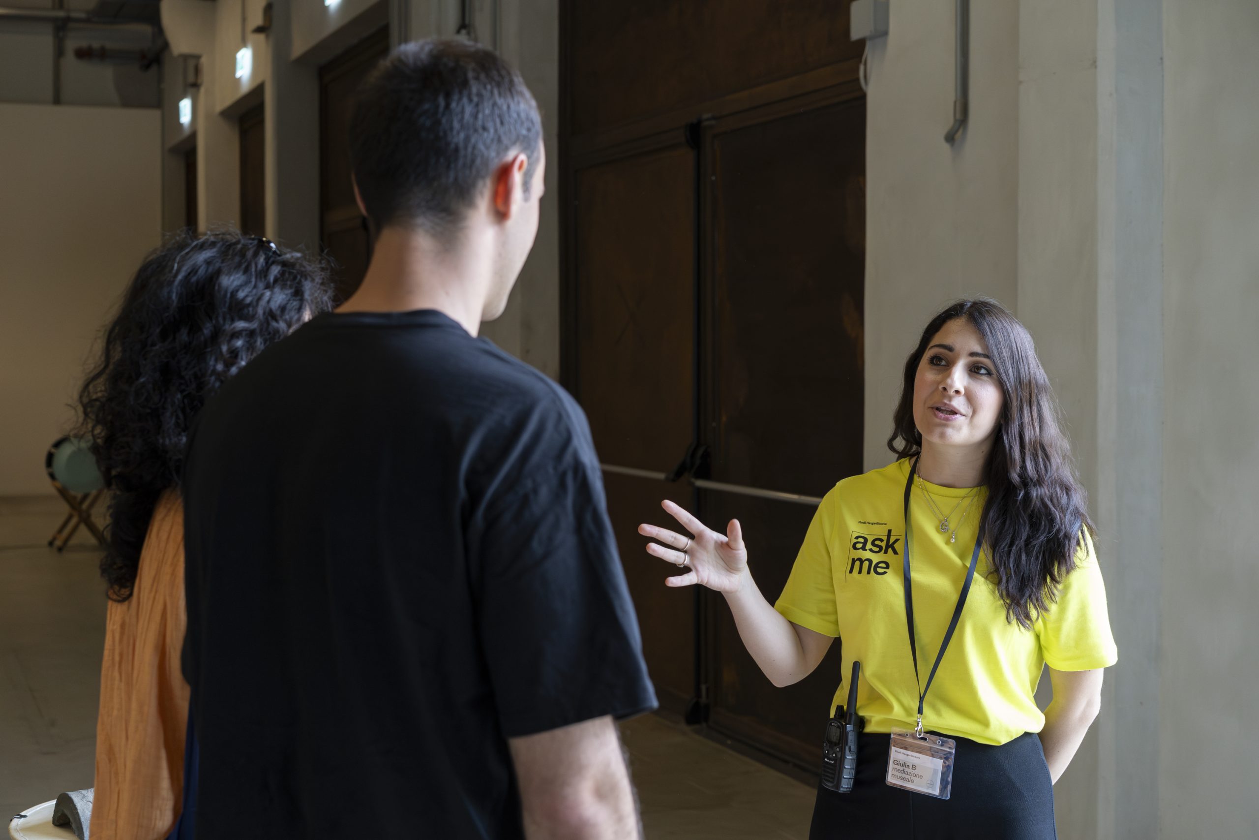 Museum mediators are professional figures with a degree in artistic disciplines and with a specific education in foreign languages and in the communication of contents to a wide range of public typologies. Mediators answer visitors' questions and facilitate, through conversation with small groups or individuals, an open and curious attitude towards contemporary art. Furthermore they nurture reflections and investigations on artworks and artists.