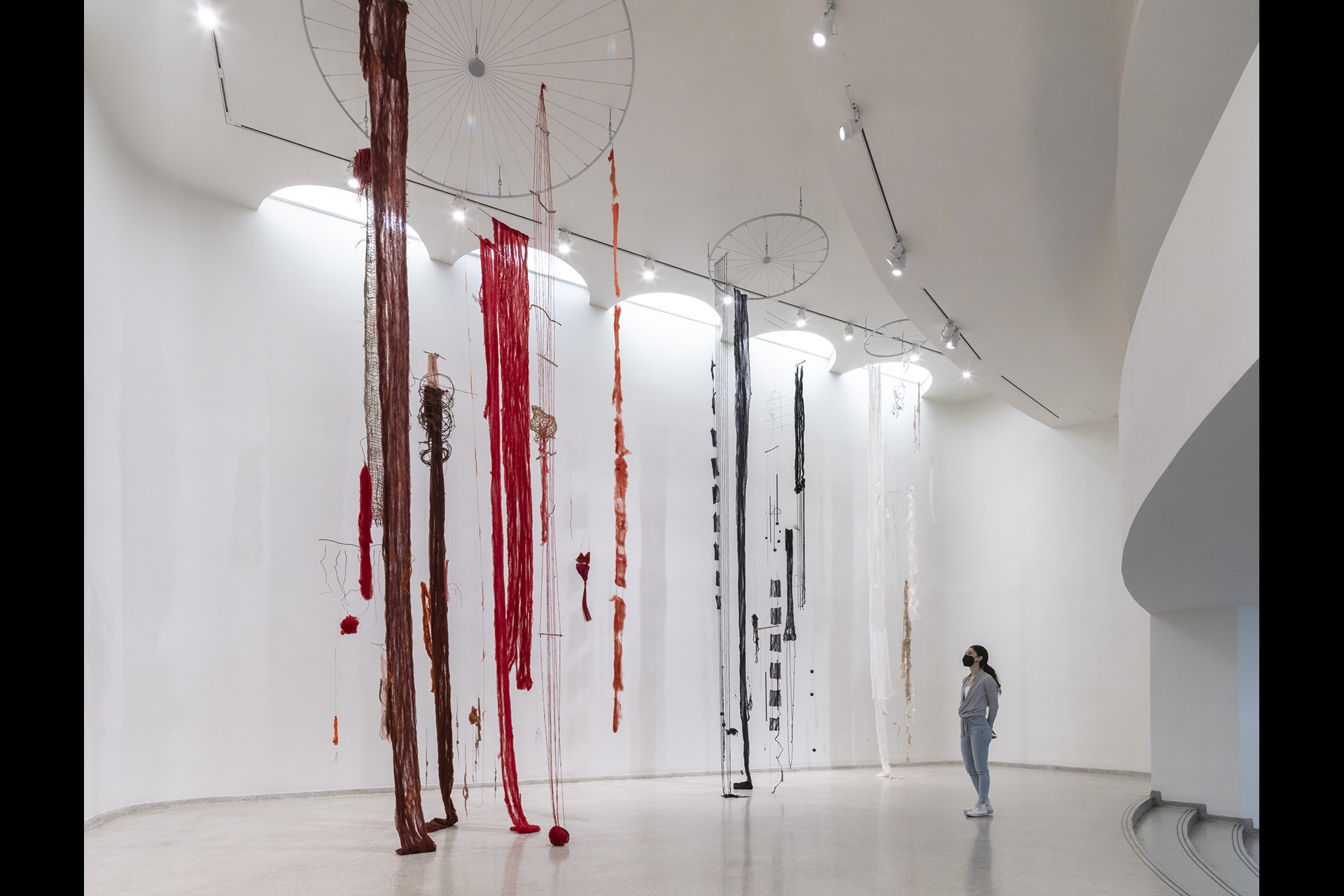 Vicuña’s pieces coexist in surprising formal harmony, while playing with scales ranging from the smallest to the largest. Her monumental textile installations draw inspiration from—and are named after —the quipu, the Andean knot-based system historically used to record and transmit knowledge.